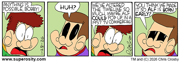 Cartoonist/Webmaster: Chris Crosby (superosity@keenspot.com) Special Thanks to Teri Crosby, Bobby Crosby and Barton Piper SUPEROSITY and all related characters are TM and (C) 1999 Chris Crosby. All rights reserved. PLEASE READ OUR PRIVACY POLICY.