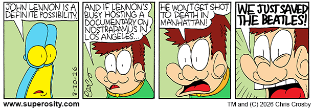 Cartoonist/Webmaster: Chris Crosby (superosity@keenspot.com) Special Thanks to Teri Crosby, Bobby Crosby and Barton Piper SUPEROSITY and all related characters are TM and (C) 1999 Chris Crosby. All rights reserved. PLEASE READ OUR PRIVACY POLICY.