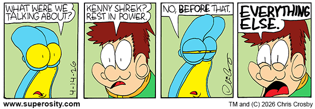Cartoonist/Webmaster: Chris Crosby (superosity@keenspot.com) Special Thanks to Teri Crosby, Bobby Crosby and Barton Piper SUPEROSITY and all related characters are TM and (C) 1999 Chris Crosby. All rights reserved. PLEASE READ OUR PRIVACY POLICY.