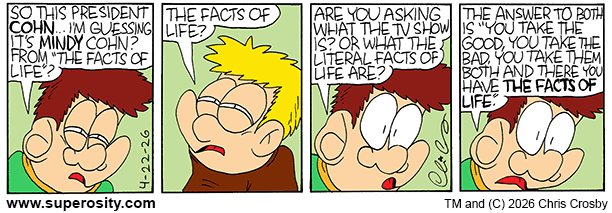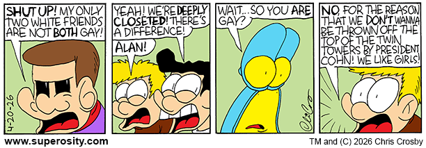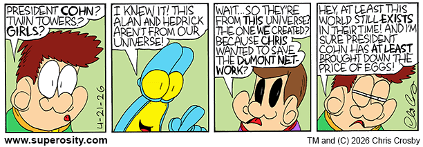 Cartoonist/Webmaster: Chris Crosby (superosity@keenspot.com) Special Thanks to Teri Crosby, Bobby Crosby and Barton Piper SUPEROSITY and all related characters are TM and (C) 1999 Chris Crosby. All rights reserved. PLEASE READ OUR PRIVACY POLICY.