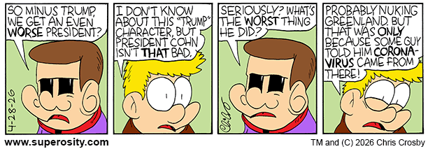 Cartoonist/Webmaster: Chris Crosby (superosity@keenspot.com) Special Thanks to Teri Crosby, Bobby Crosby and Barton Piper SUPEROSITY and all related characters are TM and (C) 1999 Chris Crosby. All rights reserved. PLEASE READ OUR PRIVACY POLICY.