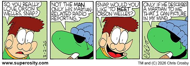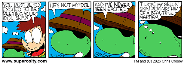Cartoonist/Webmaster: Chris Crosby (superosity@keenspot.com) Special Thanks to Teri Crosby, Bobby Crosby and Barton Piper SUPEROSITY and all related characters are TM and (C) 1999 Chris Crosby. All rights reserved. PLEASE READ OUR PRIVACY POLICY.